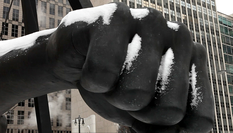 Because of the storm and the fact that Monday was a holiday, the next morning the streets were deserted in downtown Detroit. Not only were they deserted but they weren’t plowed. My subjects couldn’t get plowed out until early afternoon so that left me with the morning free. So, my daughter, husband and I decided to take a tour and do some b-roll shooting at the same time. We had the streets to ourselves, sometimes going the wrong way down one way streets or cruising very slowly, shooting out the window, but we handled it just fine in our 4 wheel drive.