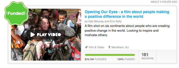 Kickstarter telling me that my daughter’s and my film project, Opening Our Eyes had been officially funded. We actually exceeded our goal of $7500 and raised just over $10,000! What a feeling – what a triumph and all possible because of our “friends”. Through crowd funding – our friends had helped us reach our goal and made our film a reality.
