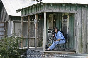 I put the wireless on Pinetop and kind of forgot about it as the day went on. I was roving around the plantation getting great b-roll and then went into the commissary where there was a big music jam going on. I had taken my earphones off outside, but quickly put them back on to protect my hearing in this incredibly loud environment. I dialed the audio way down on the camera mic but Pinetop’s wireless was still loud and clear. All a sudden I heard Pine and Pat talking about giving Ike a little tour and showing him Pinetop’s old sharecropper shack. I glanced around the commissary looking for them and couldn’t see them – I could just hear them. So, I raced outside, camera in hand just in time to see Pat, Pinetop, Ike Turner and a couple of other people walking across the grounds of the plantation headed toward Pinetop’s shack, just as the sun was setting. I caught up to the group and managed to get some great b- roll and audio of this historic moment. With camera running, I followed them inside the shack where Pinetop naturally sat down at the piano and started to play with Ike chiming in. I was in b-roll heaven and just hoping I was getting it right in camera.