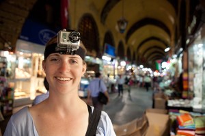 Erin wearing a GoPro Helmet Cam at Spice Bazaar in Istanbul